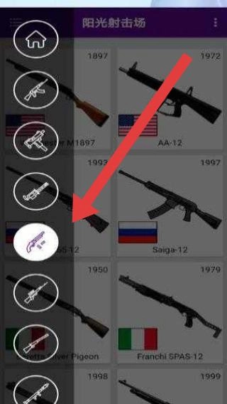 1、在武器分类页,点击对应枪械分类(红箭头指向),浏览“阳光射击场”中该类武器列表。