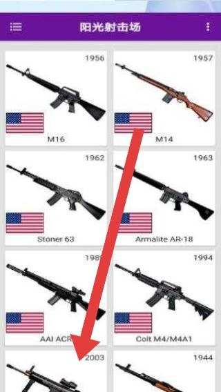 2、在武器列表,按红箭头指引,查看不同年份、国家的枪械(如M16、M14等),了解图鉴内容。