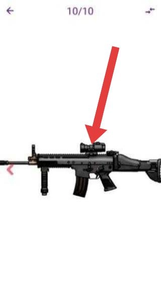 3、进入武器详情页,聚焦红箭头指向部位(瞄准镜),查看枪械细节,熟悉武器构造,完成图鉴浏览。
