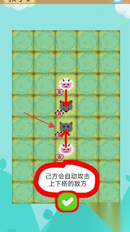 1、己方棋子会自动攻击上下相邻格子的敌方,无需手动操作,利用站位布局,形成攻防链,消灭敌人。