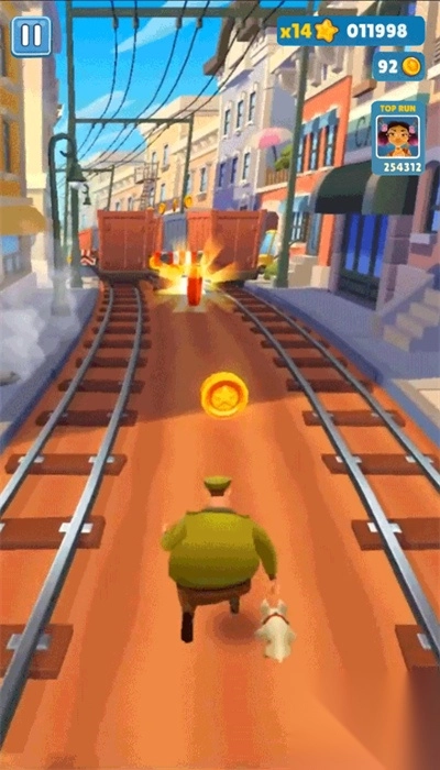 2、打造了经典的轨道跑酷场景,包含列车、角色、追击的保安,以及金币、分数显示等元素,玩家通过操控角色躲避障碍、收集道具来不断前进。