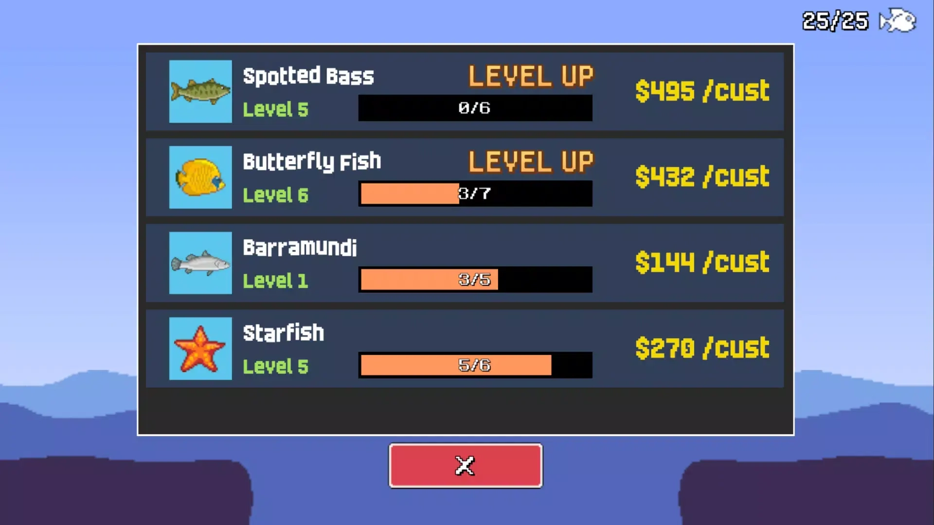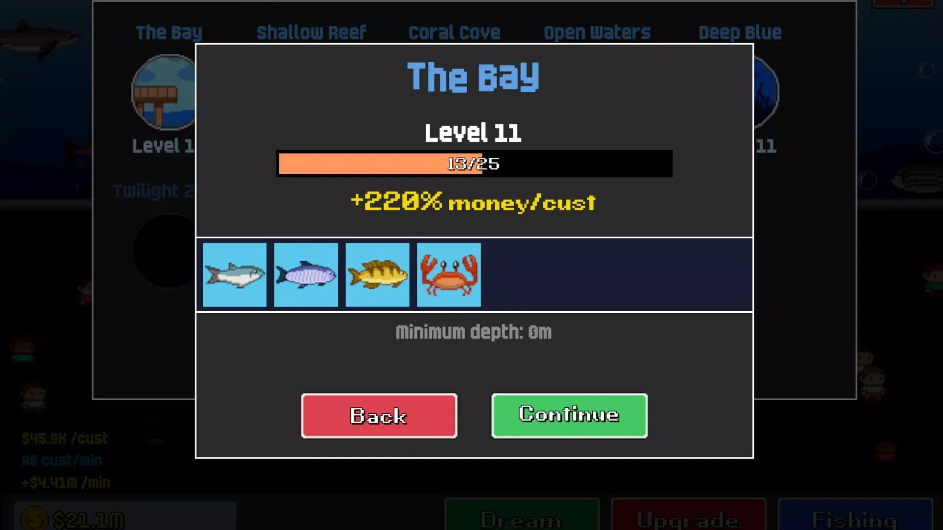 这是一款简短的增量游戏,玩家能够捕捉独特的鱼类并把它们展示在鱼缸里,游戏设计时长约为4小时。