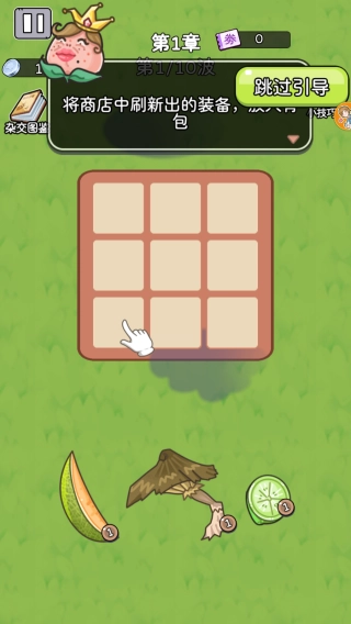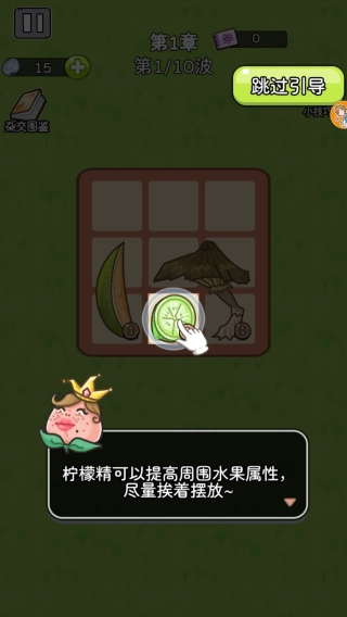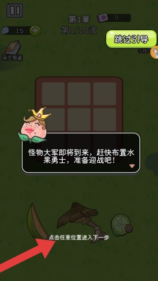 1、进度显示、功能按钮(如跳过引导、杂交图鉴)、金币数值、提示文本等元素,共同构成了初始关卡的引导场景。该玩法属于休闲塔防类型,玩家需要通过布置水果来抵御一波又一波的怪物进攻。