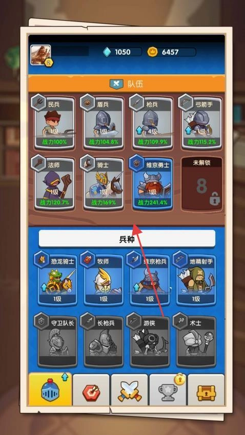 3、进入“队伍”界面,消耗金币/钻石招募、升级兵种,调整编队,优化战力,挑战更高关卡。