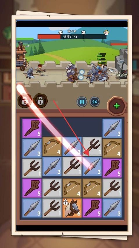2、战斗中拖动相同武器合成,提升武器等级,增强输出,应对敌人进攻。