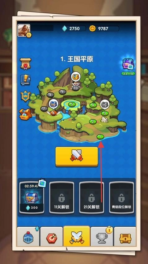 1、在“王国平原”地图,点击关卡,消耗体力进入战斗,推进“波浪1/3”挑战。