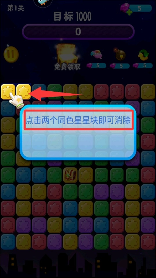 1、游戏开始后仔细观察棋盘,用手指点击两个相邻的相同星星图案,系统会自动消除并产生连锁反应。