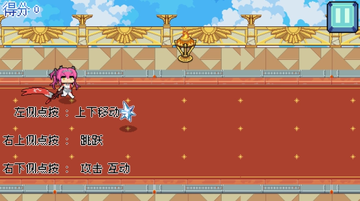1、进入游戏后:左侧区域点按可控制角色上下移动,右上侧区域点按为跳跃操作,右下侧区域点按则对应攻击与互动功能。