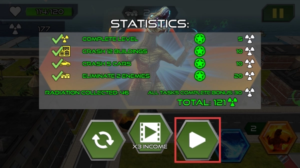 4、完成关卡破坏任务后,在统计界面点击播放按钮,开启新关卡,继续怪物破坏之旅呀。