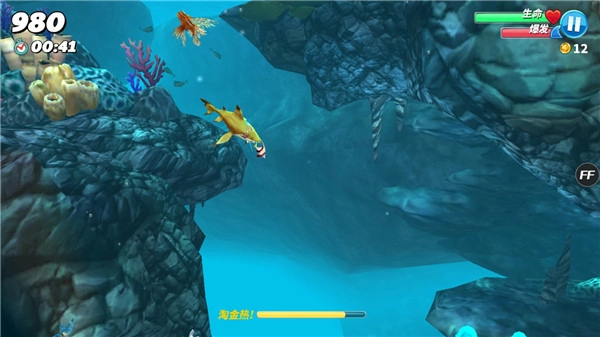 2、留意周围的危险目标。多数情况下游戏结束并非因为鲨鱼饿死,而是遇到了能攻击鲨鱼的鱼类、水母以及潜艇捕鱼船,所以要留意环境,尽可能避免遭到攻击。