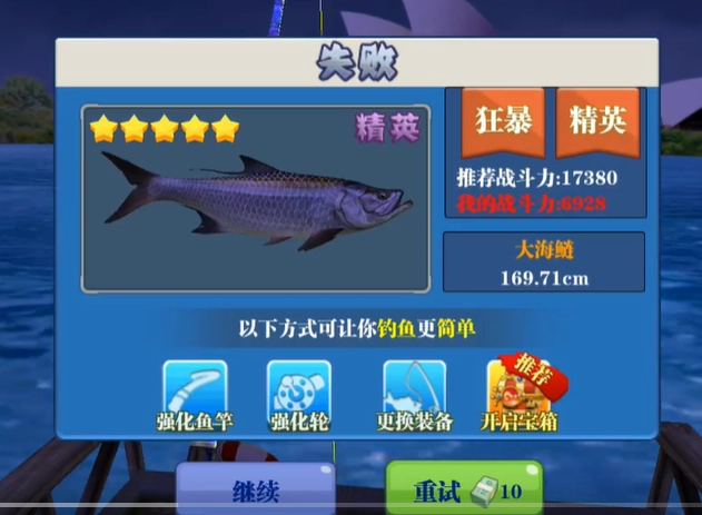 3、如果你的战斗力太低就会挑战失败,可以在游戏强化鱼竿,强化轮提升战斗力