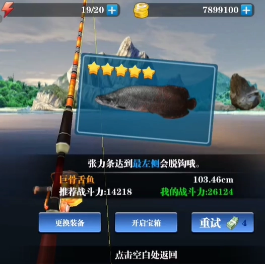 1、进入游戏就能开始钓鱼啦,要注意张力条到最左侧就会脱钩哦。巨骨舌鱼体长103.46厘米,推荐战斗力是14218,我的战斗力目前是26124。