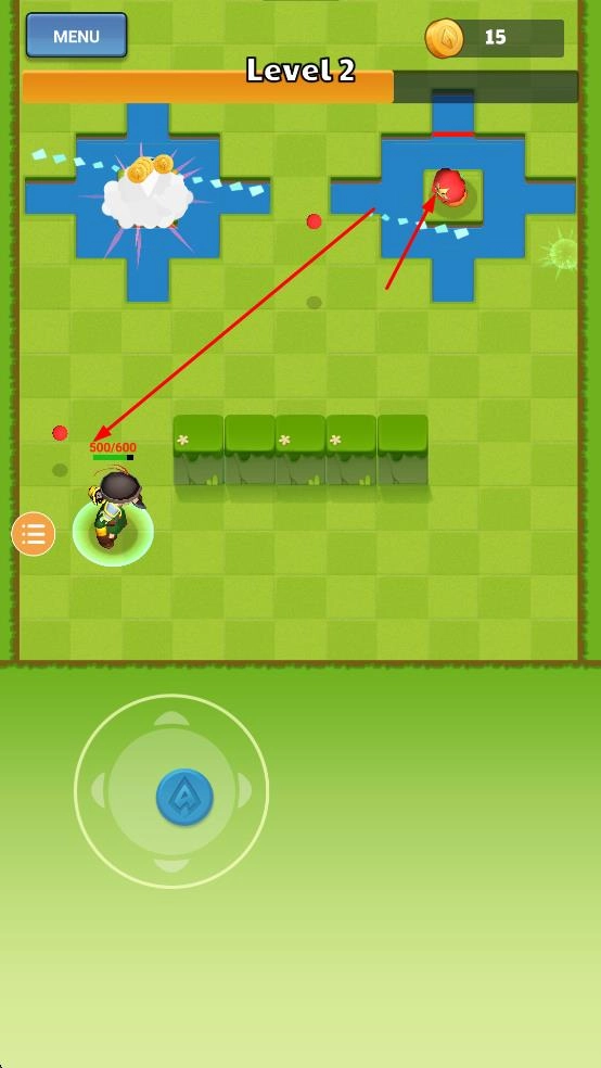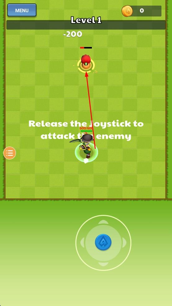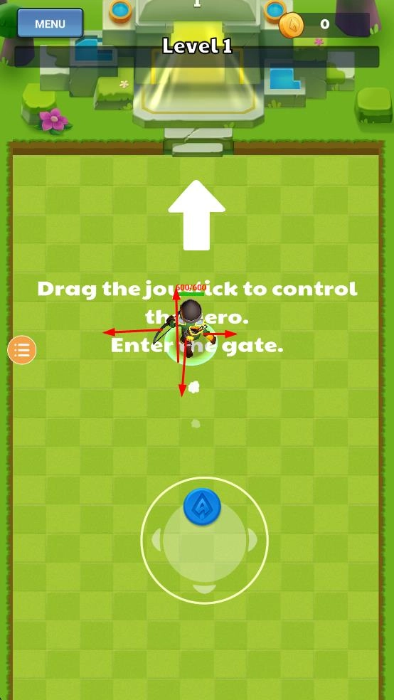 1、进入Level1界面,拖动下方虚拟摇杆控制英雄移动,依照箭头指引朝向目标区域,开启关卡进程。