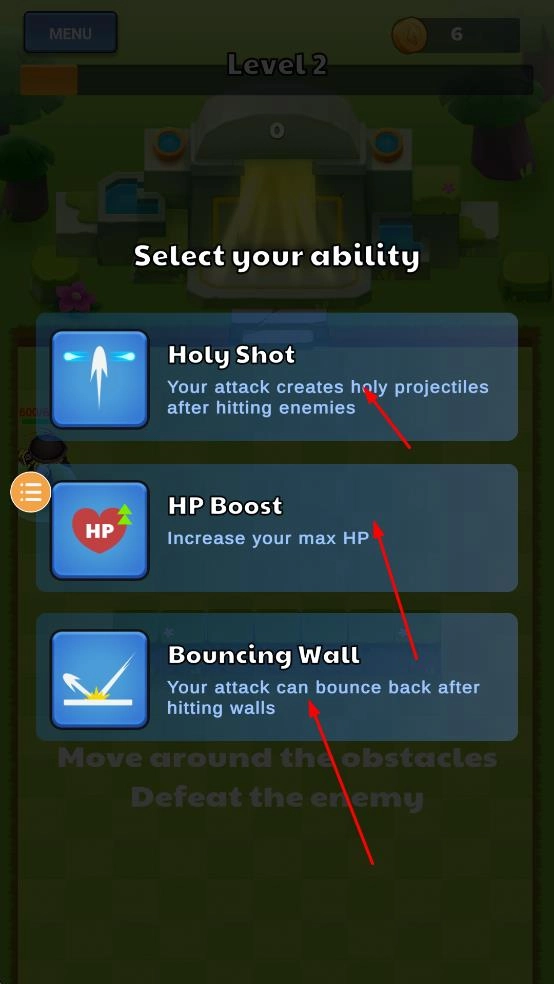 3、完成Level1后,在Level2界面选择技能,如神圣射击、血量提升、反弹墙壁等,助力后续战斗。