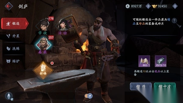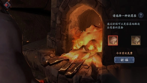 玩家获取装备需要消耗锻造材料。锻造分为“学徒锻造”和“名匠锻造”两种选择,其中名匠锻造产出精品到珍品级装备或碎片的概率比学徒锻造更高。在进行锻造操作前,玩家每天拥有一次免费祈福的机会,通过消耗三种不同类型的祈愿签,能够获得有助于锻造装备的优势状态加成。