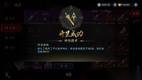 玩家可以通过升星系统,消耗材料将某件武器或防具进行特性强化,在应对敌人时更加自如。