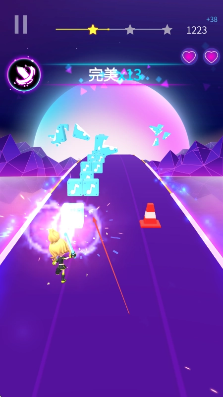 1、进入游戏操控角色沿跑道前进留意右上角爱心生命值避开红色障碍物,观察前方音符方块提前准备攻击。