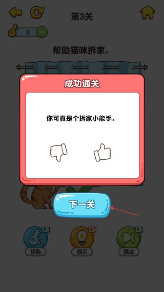 3、当猫咪成功拆家,出现绿色对勾标志后,点击弹出的下一关按钮,进入下一个关卡挑战。