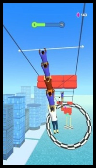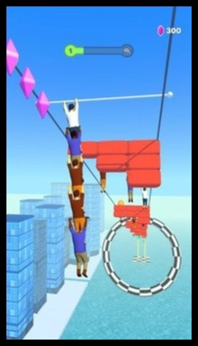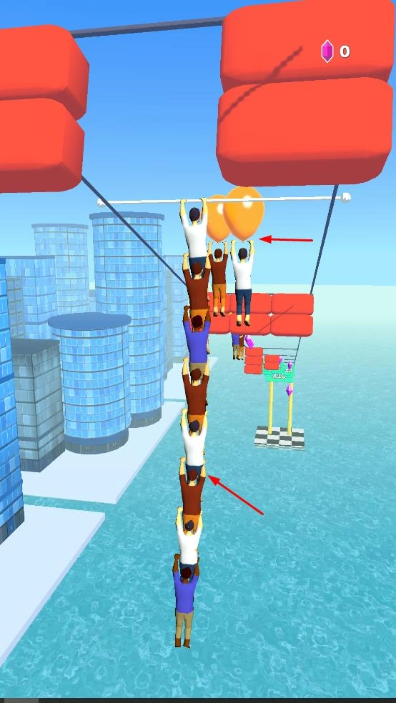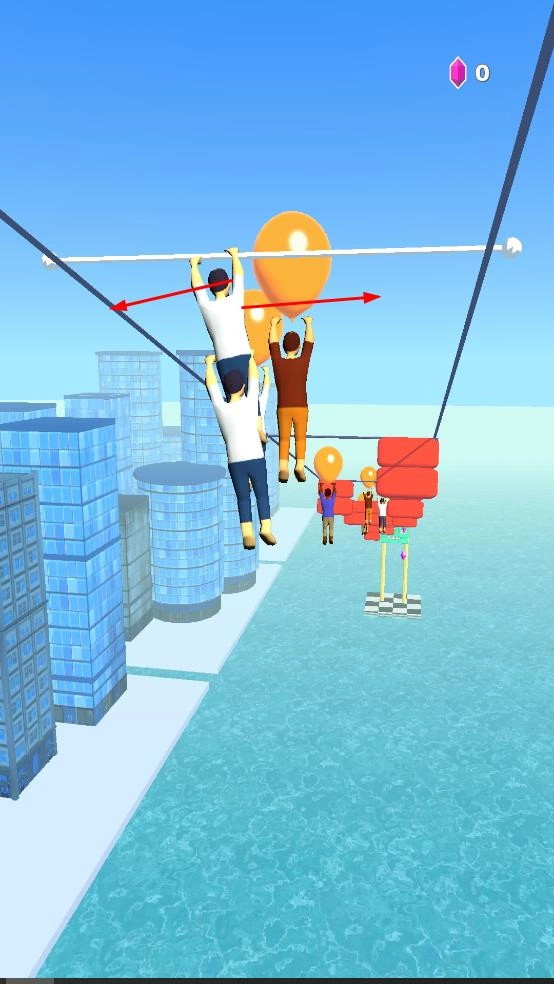 1、进入游戏后,操控角色在城市背景的绳索上左右移动,收集气球等道具,还可与其他角色堆叠,增加整体长度。