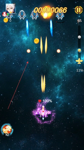 1、进入游戏,通过滑动屏幕操控己方带有紫色特效的飞机移动,留意屏幕上方显示的分数和生命值。