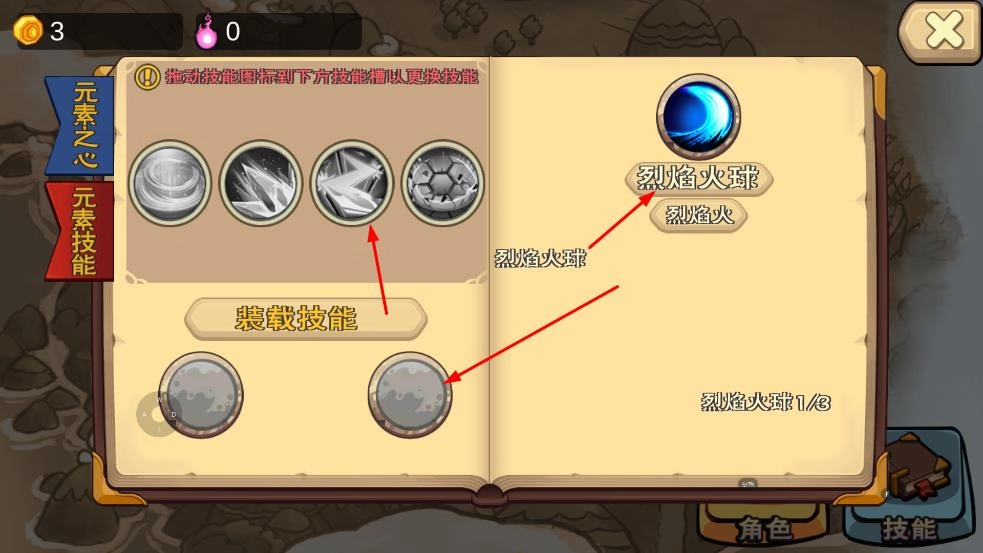 3、进入元素技能界面,拖动烈焰火球等技能图标到下方技能槽更换技能,在地图上选择解锁的区域推进,开启更多冒险内容。