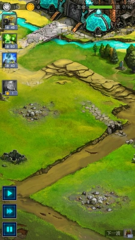 1、进入游戏后,查看上方生命值与波次数,第一波敌人来袭前,规划防御塔建造位置,开启塔防挑战。