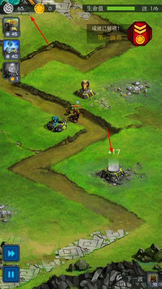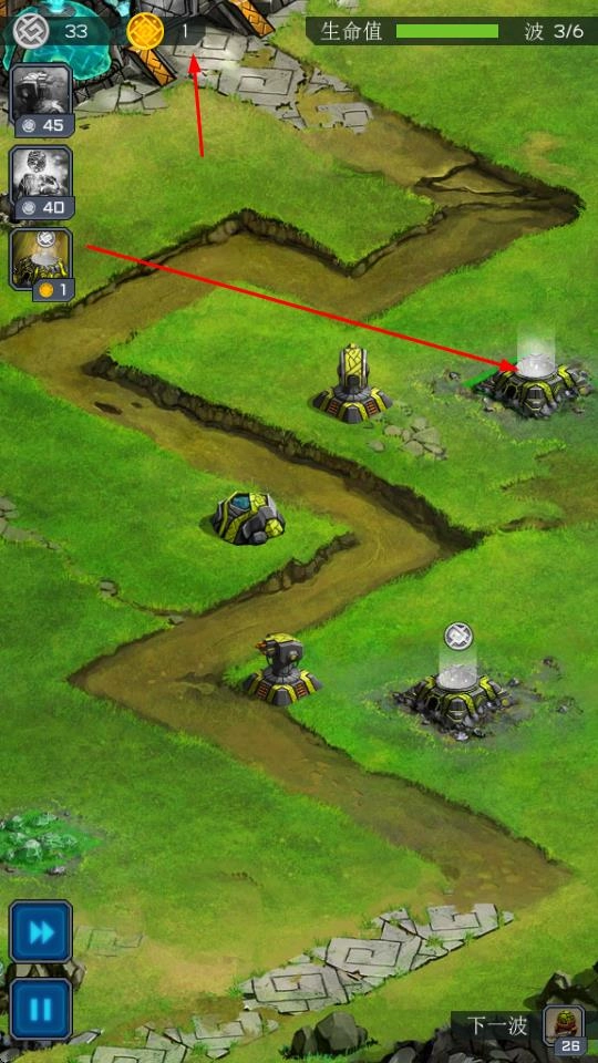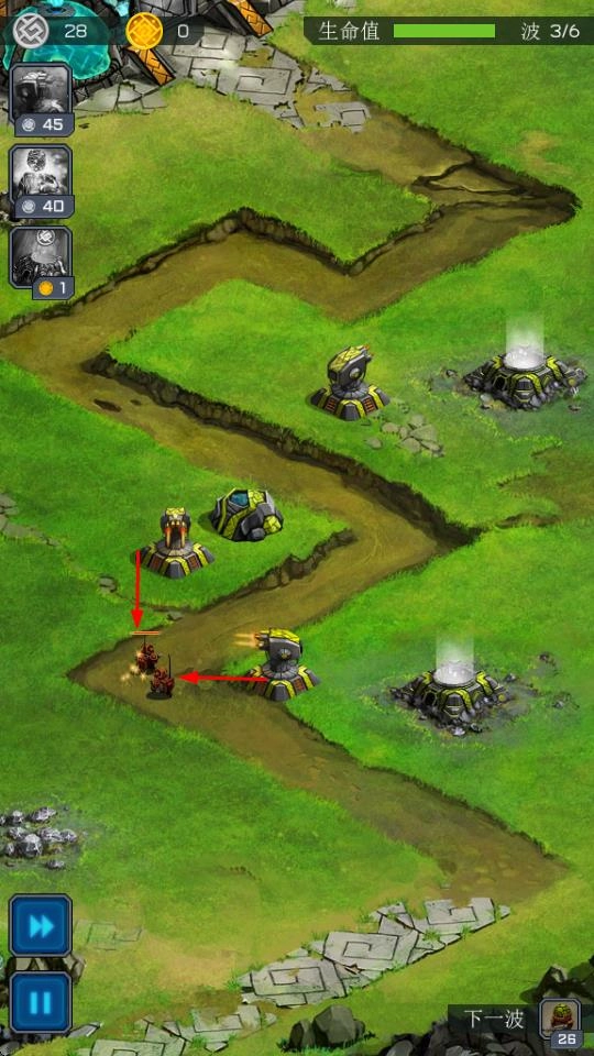 4、每波敌人结束后,准备迎接下一波,根据敌人进攻规律调整防御塔布局,守护生命值顺利通关。
