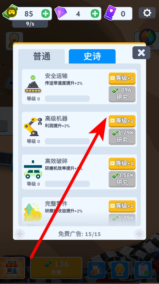 3、随后推进研究升级工作,进入科技研究领域,筛选出可开展研究的科技项目,投入相应资源进行研发;科技完成升级后,能够提升设备运行效率或是解锁新的功能,进而增加回收处理环节的收益。