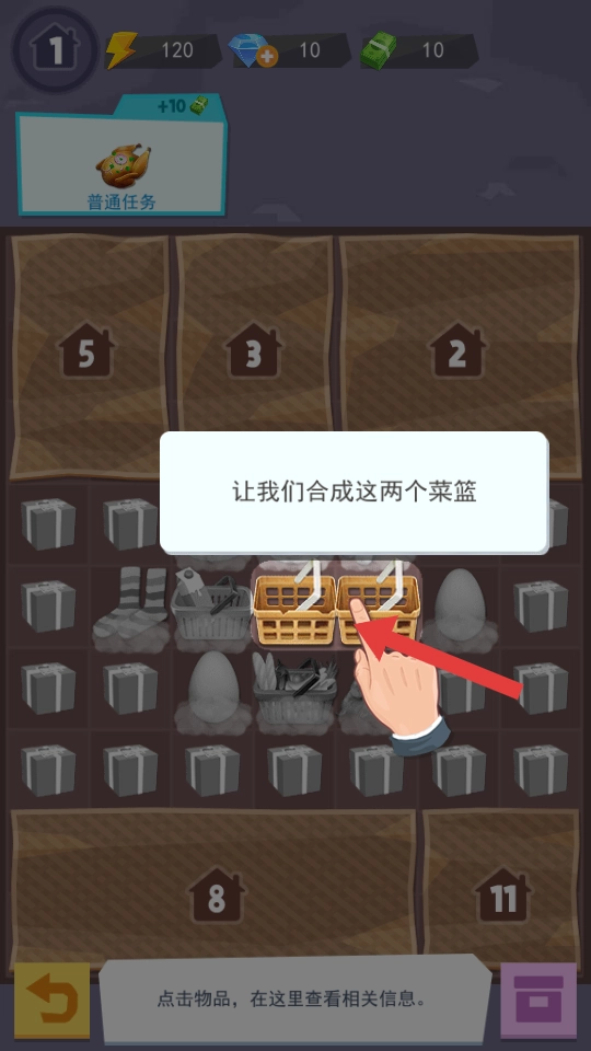 1、在游戏界面中,当出现可合成的相同物品时,按照提示点击这些物品,合成后物品会升级或转化为更高级的道具。
