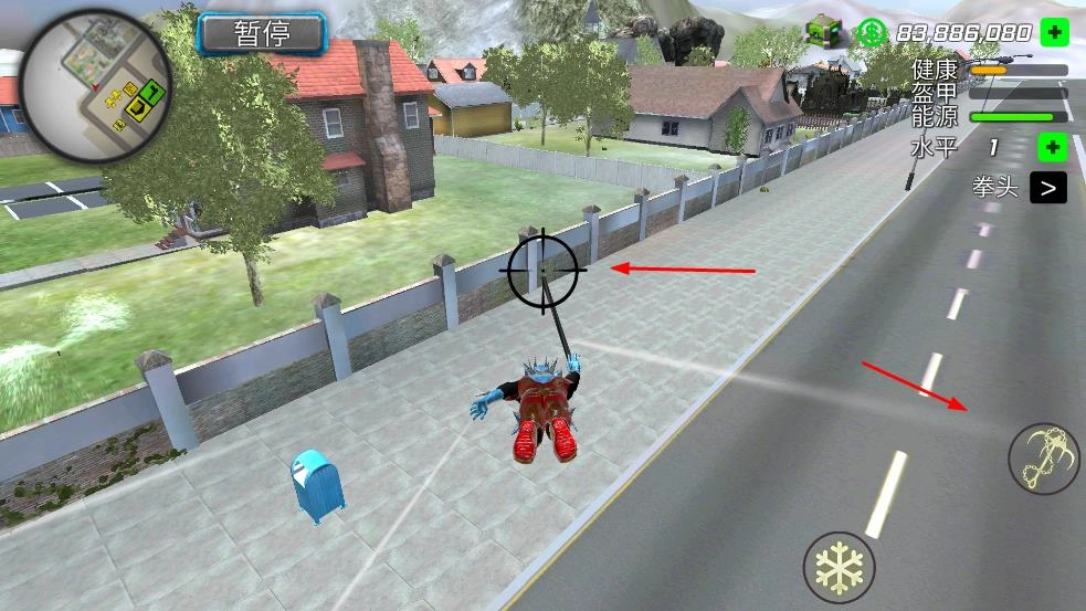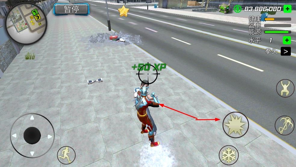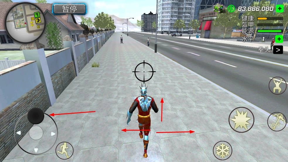 1、进入游戏后,通过左侧虚拟摇杆控制角色在都市街道移动,探索不同区域,开启英雄冒险之旅。