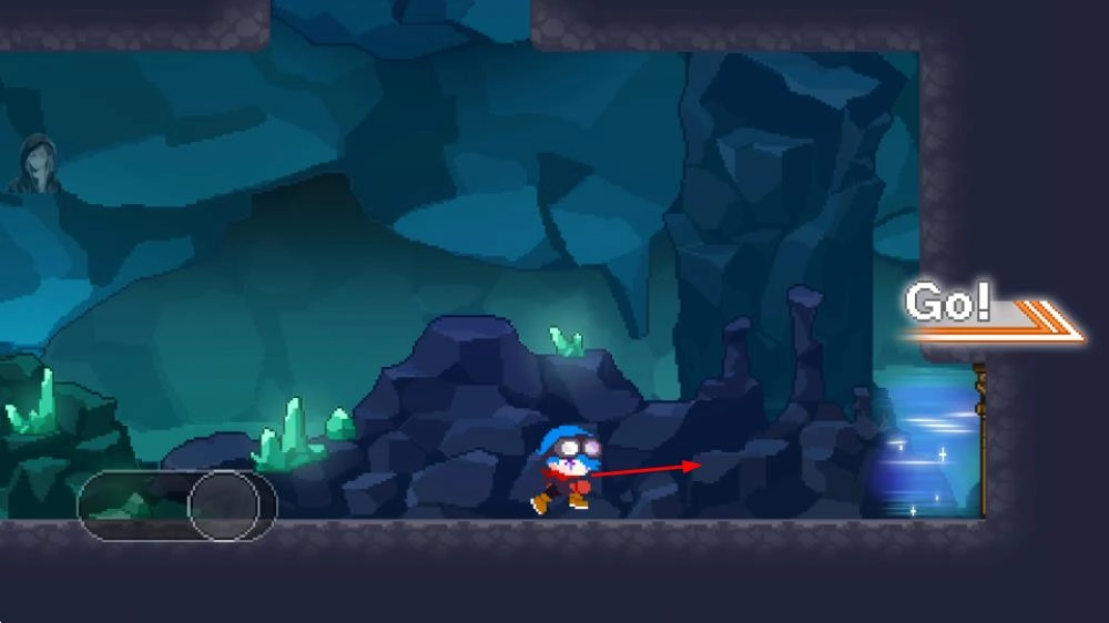 1、进入洞穴场景后,跟随Go!提示操控角色向右移动,探索布满发光晶体的洞穴区域。