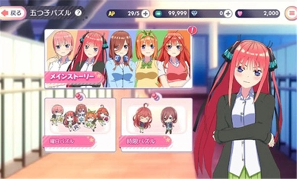 《五等分的花嫁》游戏汉化版是一款改编自同名高人气漫画的恋爱模拟类游戏。在游戏里,玩家将化身为主角上杉风太郎,和中野一花、中野二乃、中野三玖、中野四叶、中野五月这五位性格各有不同又都十分貌美的姐妹进行一连串浪漫且有趣的互动,用心去寻觅专属于自己的真爱。