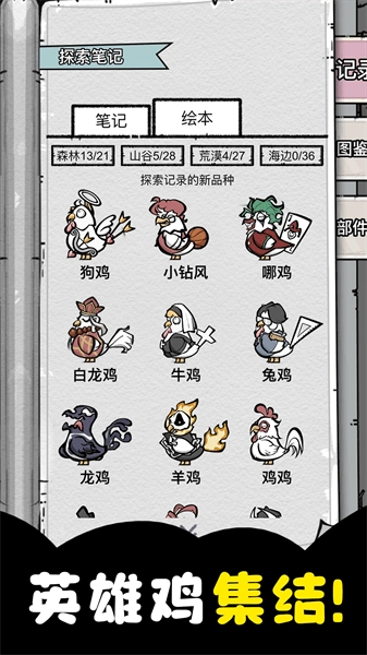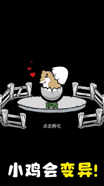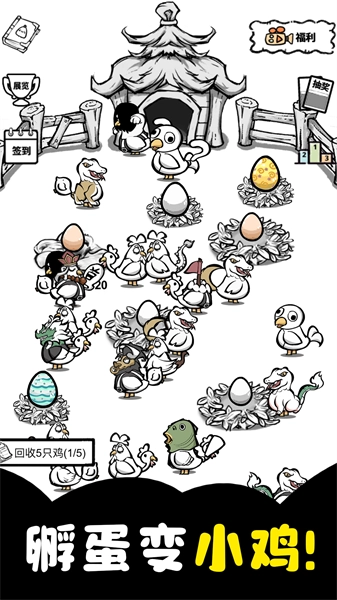 鸡场开业已经有一坤年的时间了,小鸡仔们的黑脚也已经长出来了……在游戏里,你能够通过孵化来获取并收集各种各样既奇特又可爱的小鸡,从而点亮每一个图鉴。