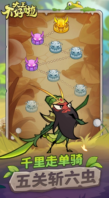 《大王不好啦》是一款创意十足的三国卡牌放置游戏,它别出心裁地将昆虫元素与三国武将相融合,塑造出一个个诙谐逗趣的昆虫拟人化三国英雄形象。游戏以轻松的放置养成作为核心玩法,玩家能够自由招募三国英雄,并借助装备、天赋、翼纹、神器等多元化的养成系统,持续提升自身的战斗能力。游戏支持全程自动战斗与多倍加速功能,让玩家可以轻松惬意地畅玩,无需耗费过多精力。此外,《大王不好啦》还拥有丰富多样的副本挑战模式,像河岸冒险、地穴探险以及过关斩虫等,这些内容大大增强了游戏的趣味性和策略深度。