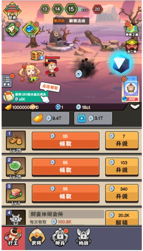 2、化身为打工人,在各个店铺工作,获得海量银币资源,升级你的武将。