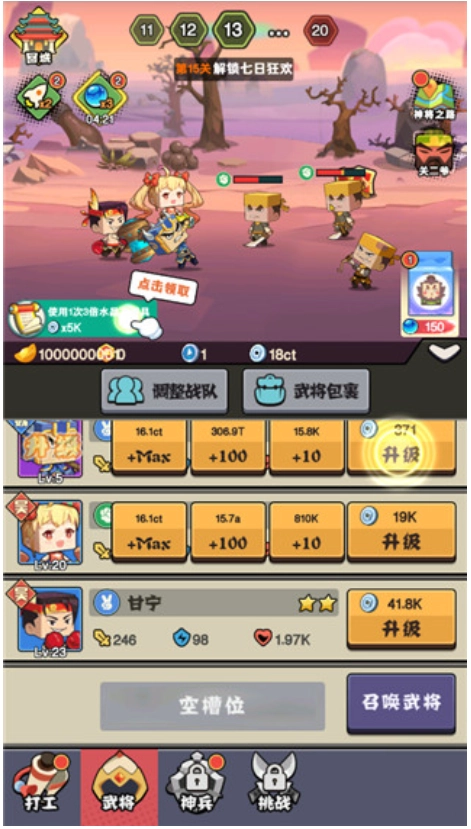 4、这款放置挂机游戏的内容性十分丰富,不仅有职业划分与属性克制的设定,还加入了不同品质、星级的武将盲盒收集玩法,让玩家能体验全新的三国冒险,各类惊喜内容层出不穷,游戏的耐玩性相当高。