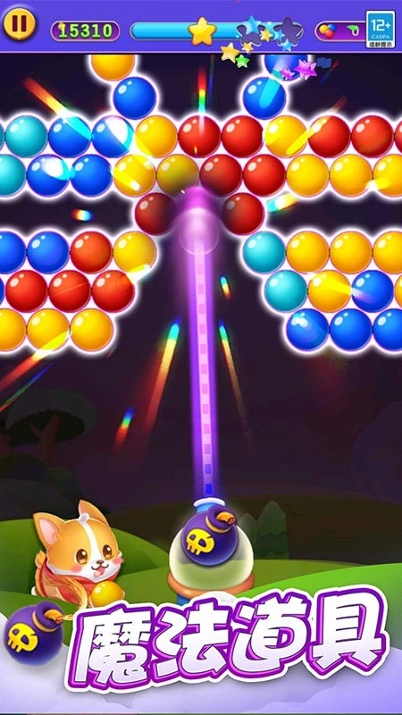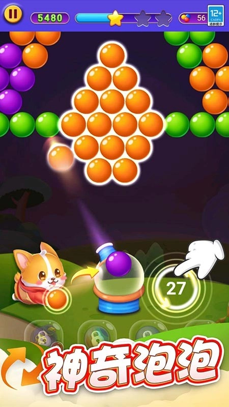 点击屏幕发射泡泡,将3个或以上泡泡连在一起,泡泡消去。更少射击,更多的连击,赢得海量的分数。