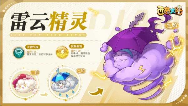 第三类是雷云精灵,他看起来总是不太开心,壮硕的手臂习惯性地抱在胸前,皱眉的模样让人觉得不好接近。因为自带生人勿近的气场,很少有人知道他的过往。不过,他睡着时会发出震天响的鼾声,这倒是让他“名声远扬”的另一个特点。代表技能