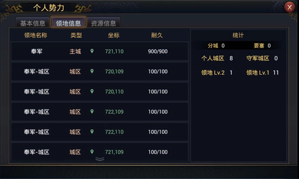 3)“领地信息”显示所有领地的类型、坐标、耐久、等级以及所占据的附属势力。分城、要塞、城区、各个等级的领地数目还会分别统计。