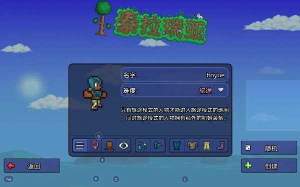 角色难度设置包含旅途、软核、中核、硬核四种类型。 旅途难度是其中最简单的一档,角色初始会配备铁质装备、法杖、火把(要是开局就掉落地面或者处于夜晚场景,这个道具会很实用)、一对翅膀,还有一只具备攻击敌人能力的宠物鸟;需要注意的是,选择旅途难度的角色仅能进入旅途难度的地图。