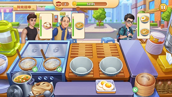游戏中,你可搭配多种道具提升经营效率:比如超级烹饪道具能加快制作速度,让所有食物瞬间完成,保证及时出餐;若顾客等待过久,耐心值会慢慢下降,因此合理规划时间与资源十分关键。