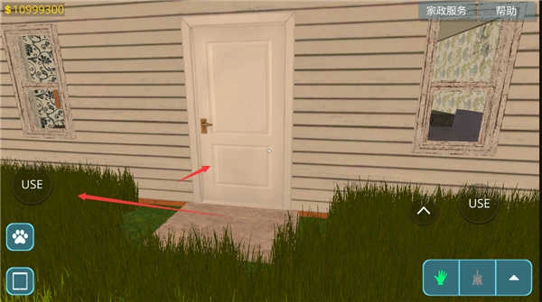 1、首先打开房屋设计大亨,进入游戏后默认是简体中文界面。我们可以通过移动操作控制角色前往前方的房间,点击左下角的按键就能开门。