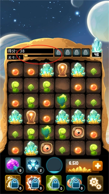 3、当顶部的进度条满了之后,就会进入下一关,还会奖励一些金矿和水晶矿。除此之外,一定要尽量多造成一些连击,连击次数越多,分数增加越快,还会奖励额外的水晶矿增加行动次数。