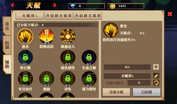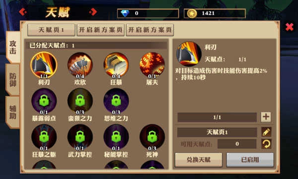 天赋技能按照属性划分共分为:攻击、防御、辅助三大类;