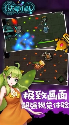 1、游戏操作相当简单,采用了常见的虚拟双摇杆模式,玩家只需操控小法师进行移动、翻滚和释放技能,而且《法师小妹》还添加了自动战斗功能,能协助玩家消灭关卡里的敌人与首领。