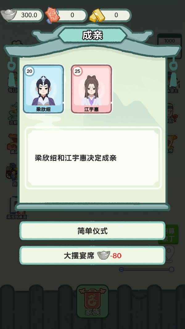 2、家族成员培养:家族成员具备独立的性格与属性设定,例如天资会左右其学习能力,品行则关联着家族的声誉及人际关系。