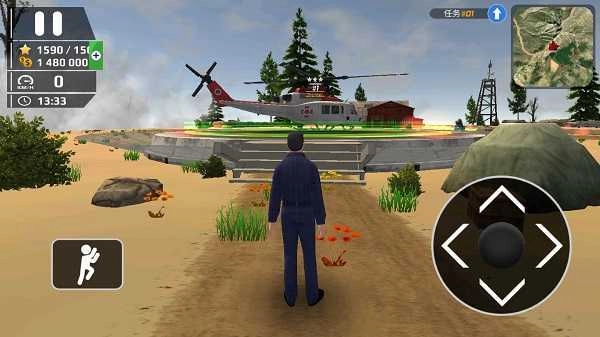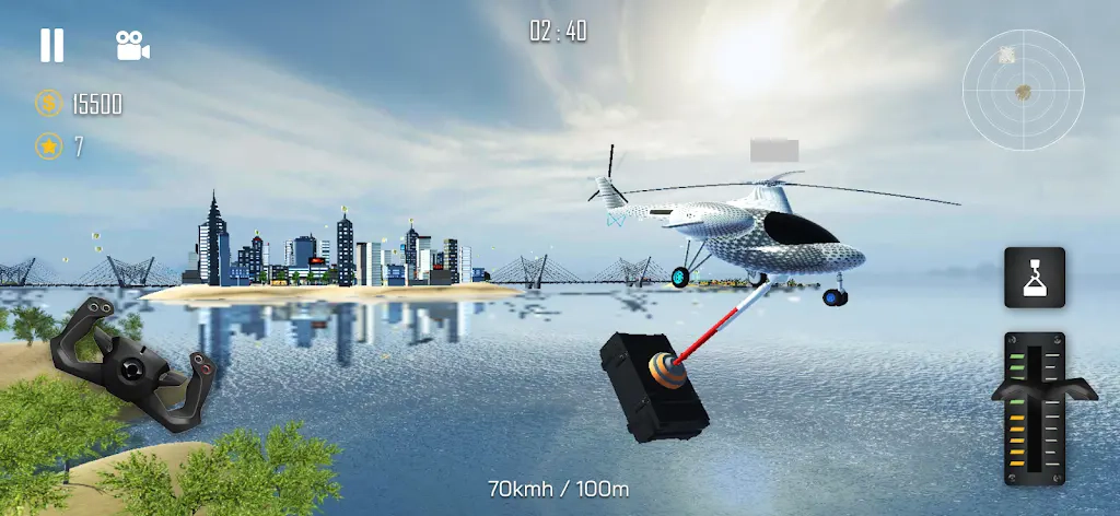7、点击“开始发动”按钮后,通过前后左右推动左侧的控制区域可调节直升机的飞行高度,而滑动虚拟摇杆则能操控直升机的飞行方向。