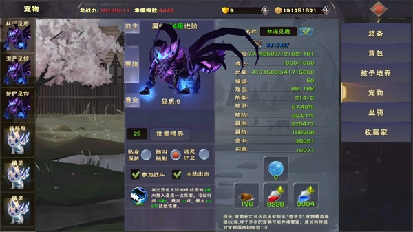 背包(宠物):在这里能够对宠物进行喂养操作,还可以设置宠物的攻击模式,另外也能为宠物进行复活、回血,或是将其转变为赛宠、进行放生等操作……