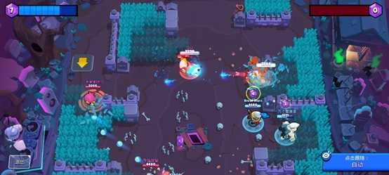游戏采用竖版形式呈现战斗场景,和《皇室战争》类似,玩家以上帝视角进行游戏。与多数MOBA游戏不同,《荒野乱斗》没有多个技能组合,也没有进攻防御等提示,它精简了大量繁琐操作。竖版左侧是虚拟摇杆,用于控制角色移动走位,玩家通过点击屏幕进行射击。当弹药击中敌方时,竖版右侧的能量槽会开始积蓄能量,能量攒满后骷髅头会点亮,此时即可释放大招。
