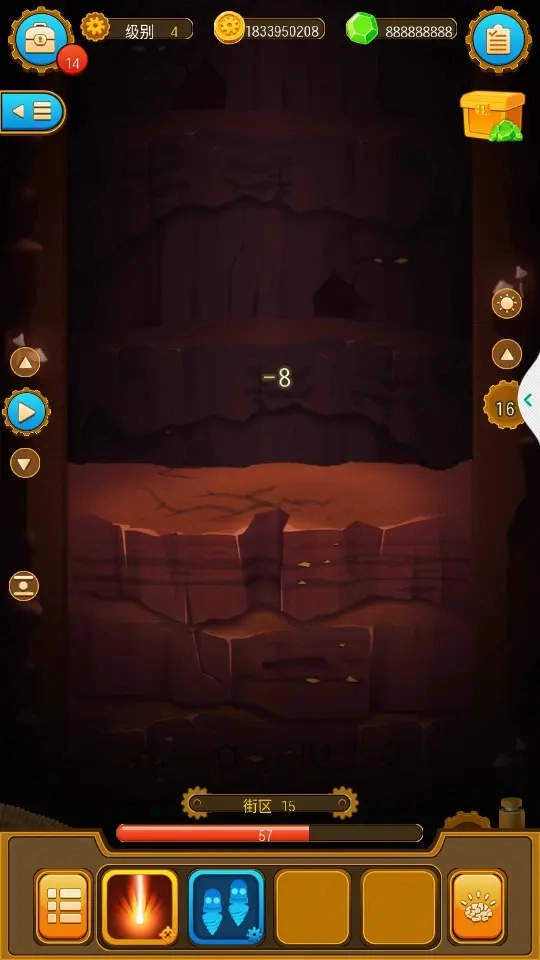 7、升级地面建筑会消耗大量金币,得好好权衡这些金币是用来升级建筑还是提升武器。打到145米左右时会遇到比较强力的小怪,35级的武器根本对付不了,而新武器要升到70级才能解锁。建议这时候放慢向下挖掘的进度,多开矿台来积累矿物赚钱,第一笔钱优先升级冶炼厂和工艺场(之前花40绿宝石的作用这时候就体现出来了),之后攒钱速度会变得非常快,武器之类的升级也就轻松多了。